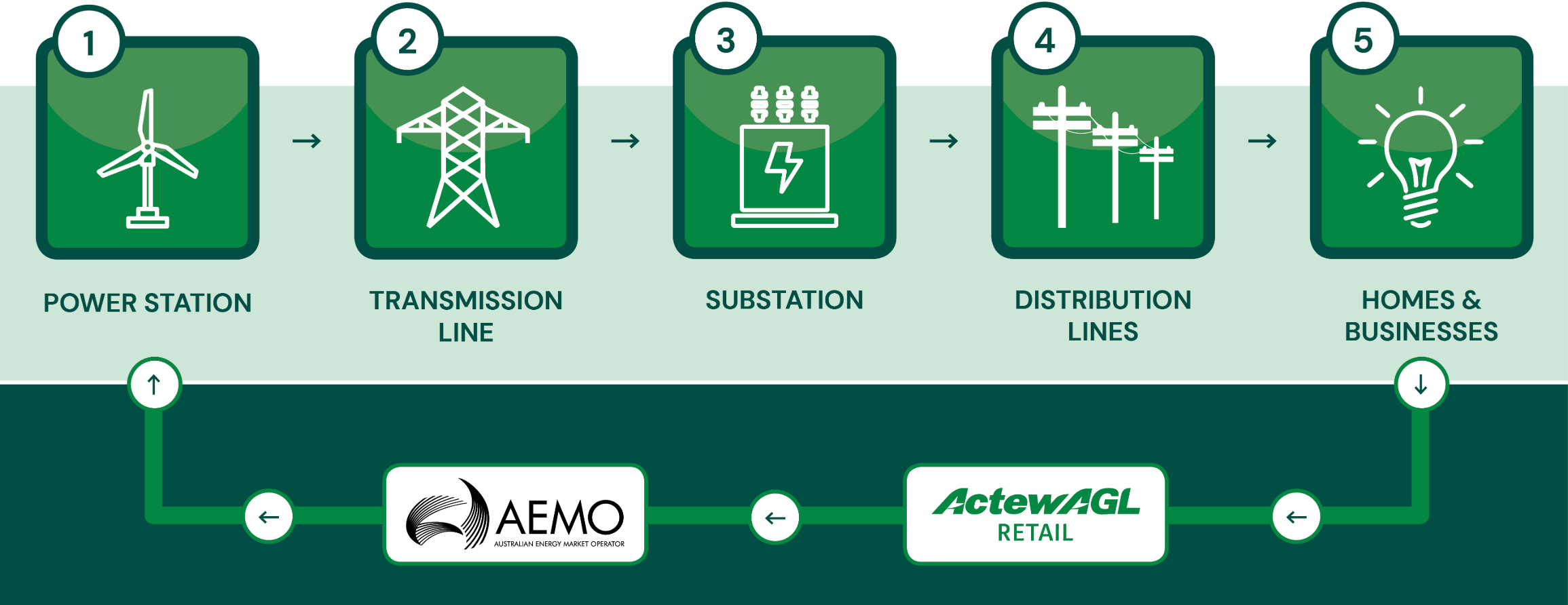 Huge power stations convert energy from sunlight, wind, gas, water and coal into electricity using generators. They then sell the electricity to retailers through the National Electricity Market (made up of power stations, distributors like Evoenergy and retailers like ActewAGL).